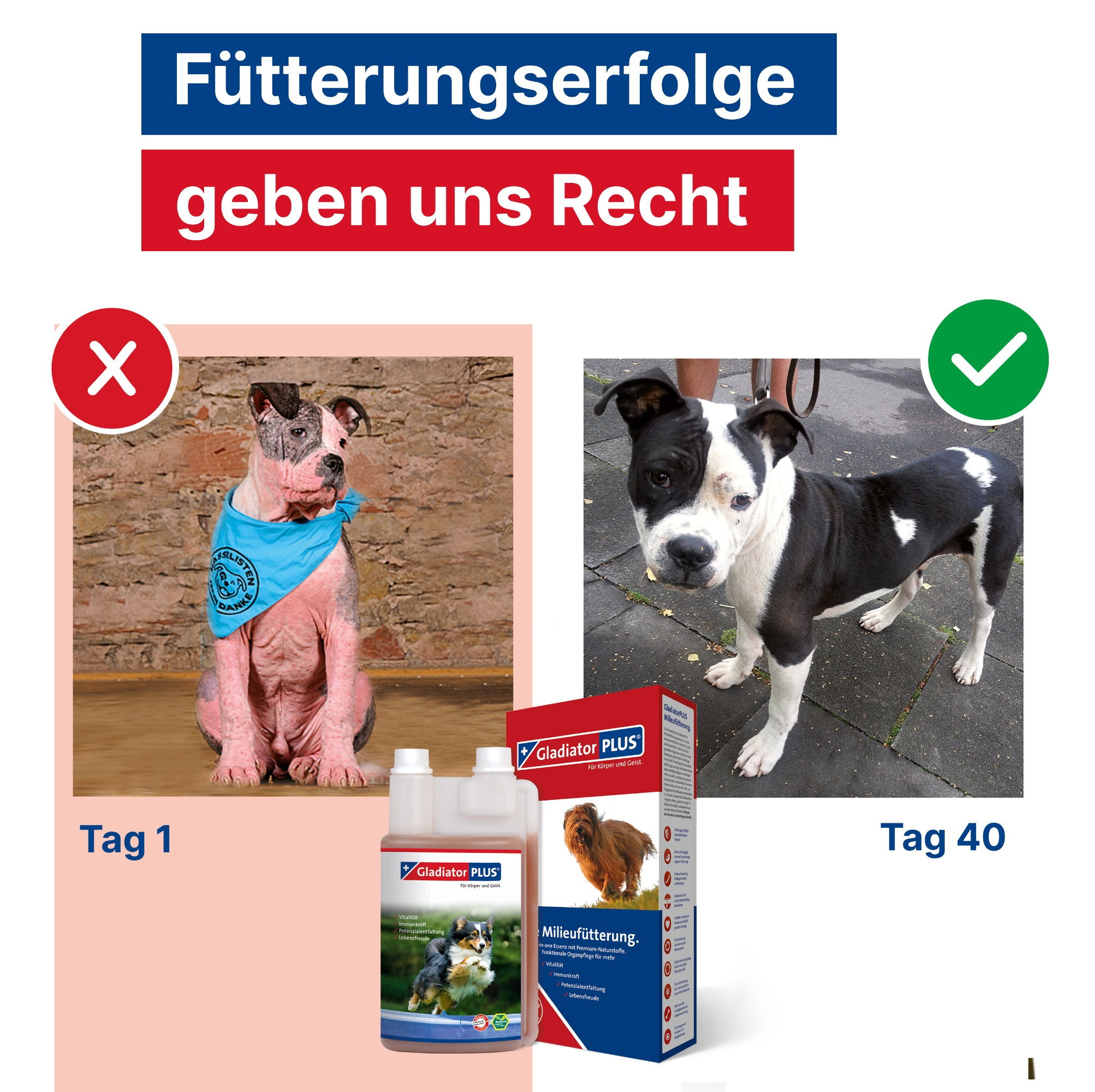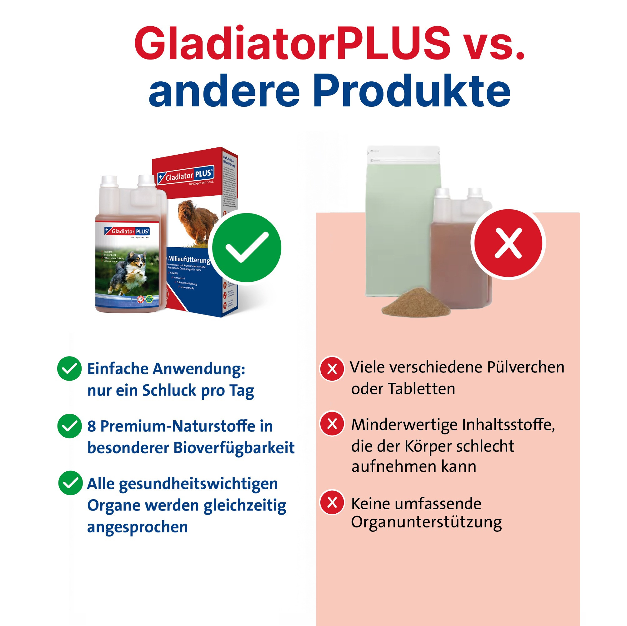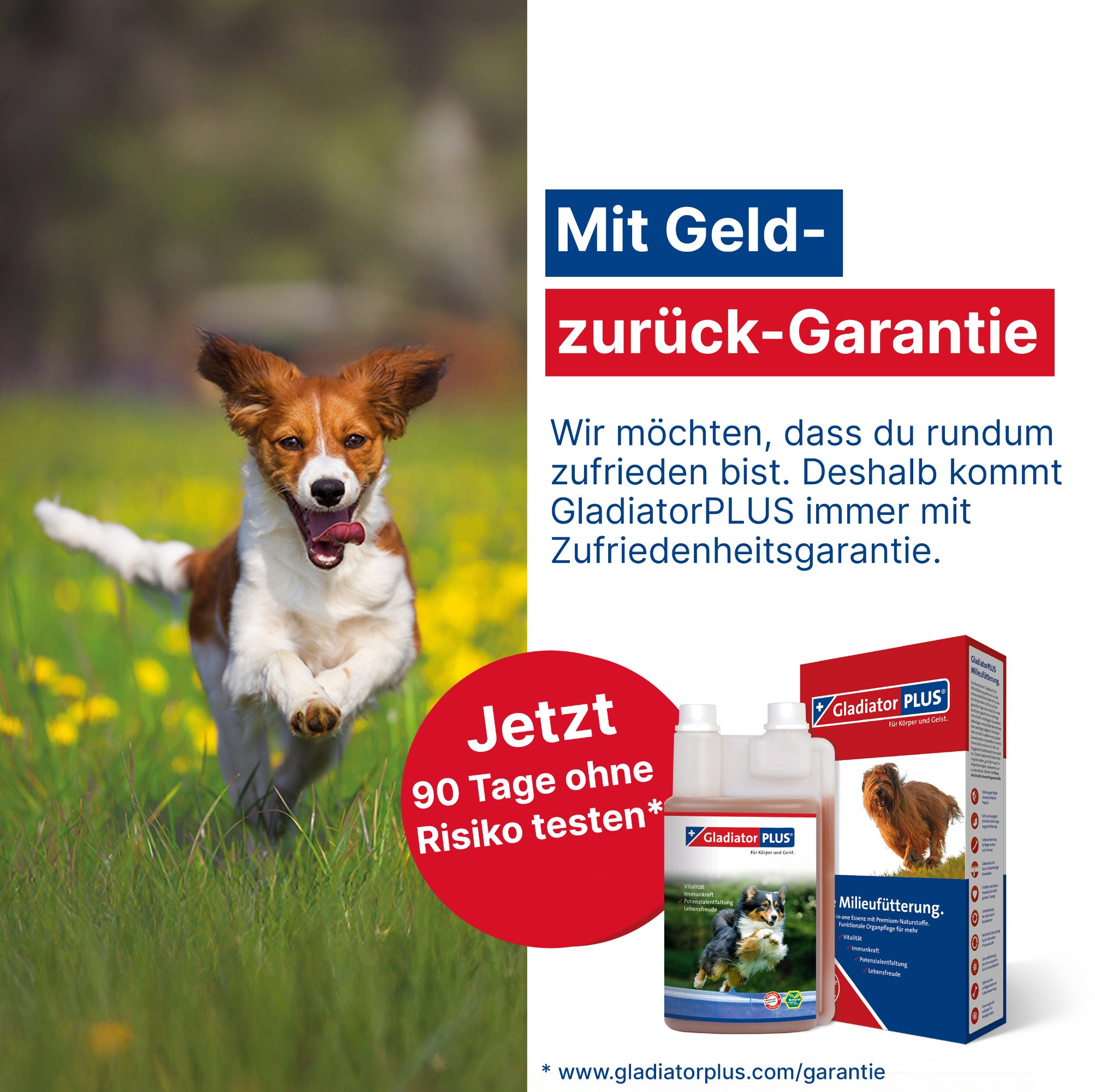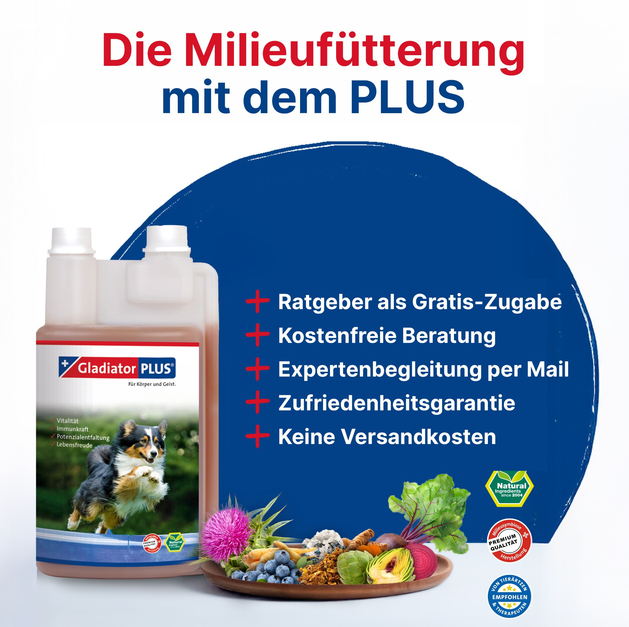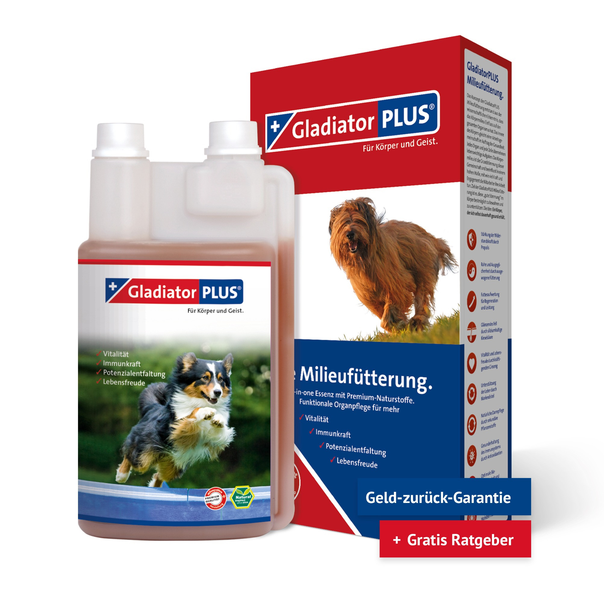 Weil es nicht einzelne Symptome bekämpft, sondern den gesamten Organismus deines Hundes ganzheitlich unterstützt. Die Milieufütterung stärkt zentrale Gesundheitsbereiche wie Körpermilieu, Stoffwechsel, Leber, Darm und Immunsystem – also genau die Schaltstellen, die maßgeblich für Gesundheit und Lebensfreude verantwortlich sind. Die enthaltenen Naturstoffe sind so kombiniert, dass sie sich in ihrer Zusammensetzung optimal ergänzen und dein Hund sie besonders gut verwerten kann. Das macht GladiatorPLUS zur intelligenten Lösung – für Tiere jeden Alters, jeder Rasse und bei den meisten Herausforderungen.