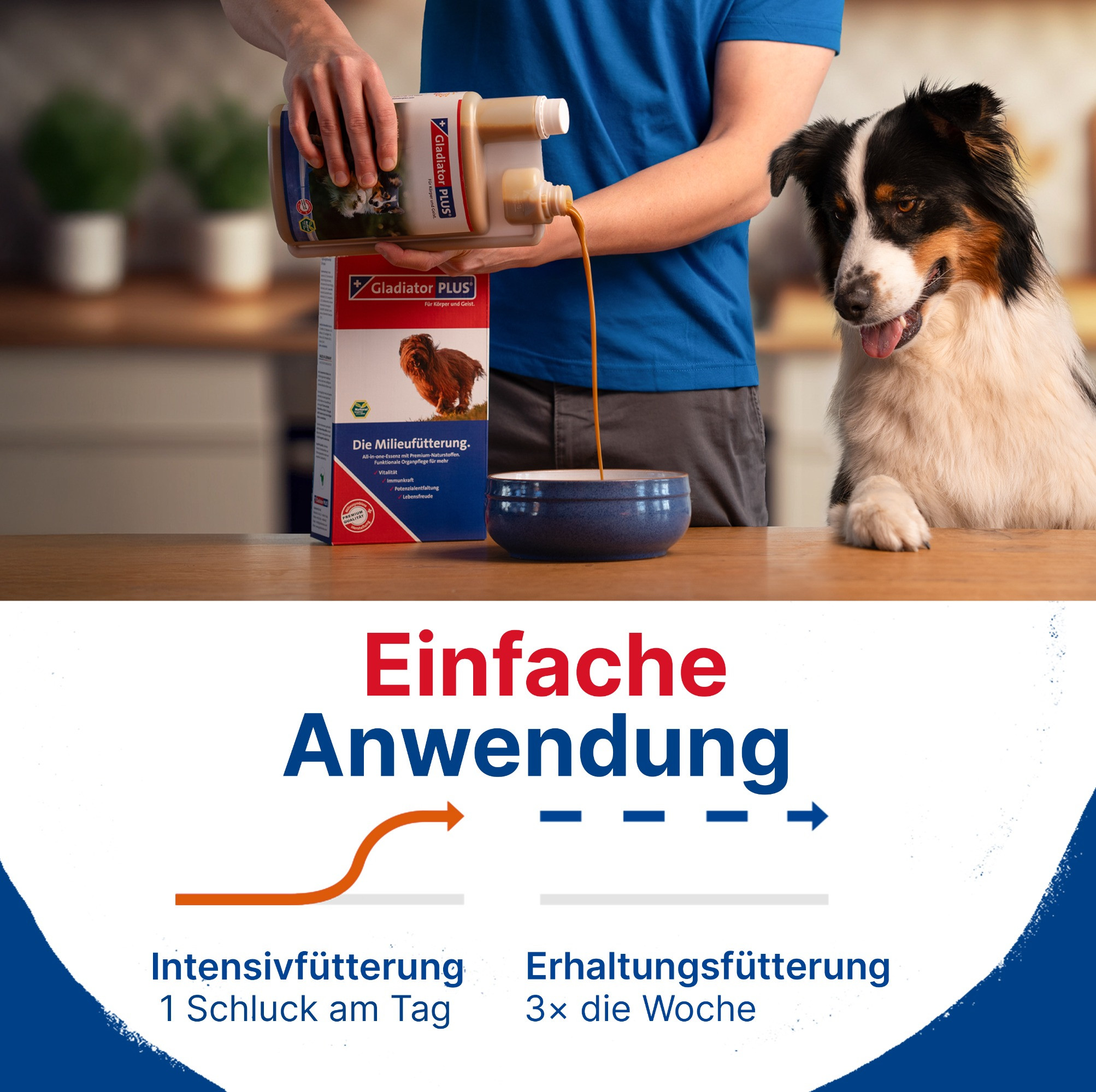 Weil weniger oft mehr ist – und viel meist nicht viel hilft. Zumal herkömmliche Ergänzungsfuttermittel nicht selten unnötige Füllstoffe oder schlecht verwertbare Substanzen enthalten, die dein Hund zusätzlich belasten können. Statt zahlreiche Einzelmittel zu kombinieren, bekommst du mit GladiatorPLUS eine durchdachte All-in-one-Lösung, die besonders bioverfügbar ist und sehr grundsätzlich ansetzt: Körpermilieu, Stoffwechsel, Leber, Darm und Immunsystem. Für Unterstützung, die auch ankommt. Und einfach ist – mit nur einem Schluck pro Tag.