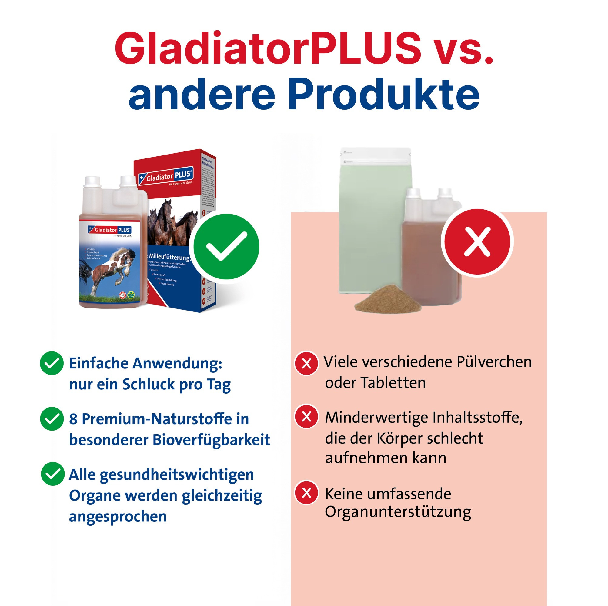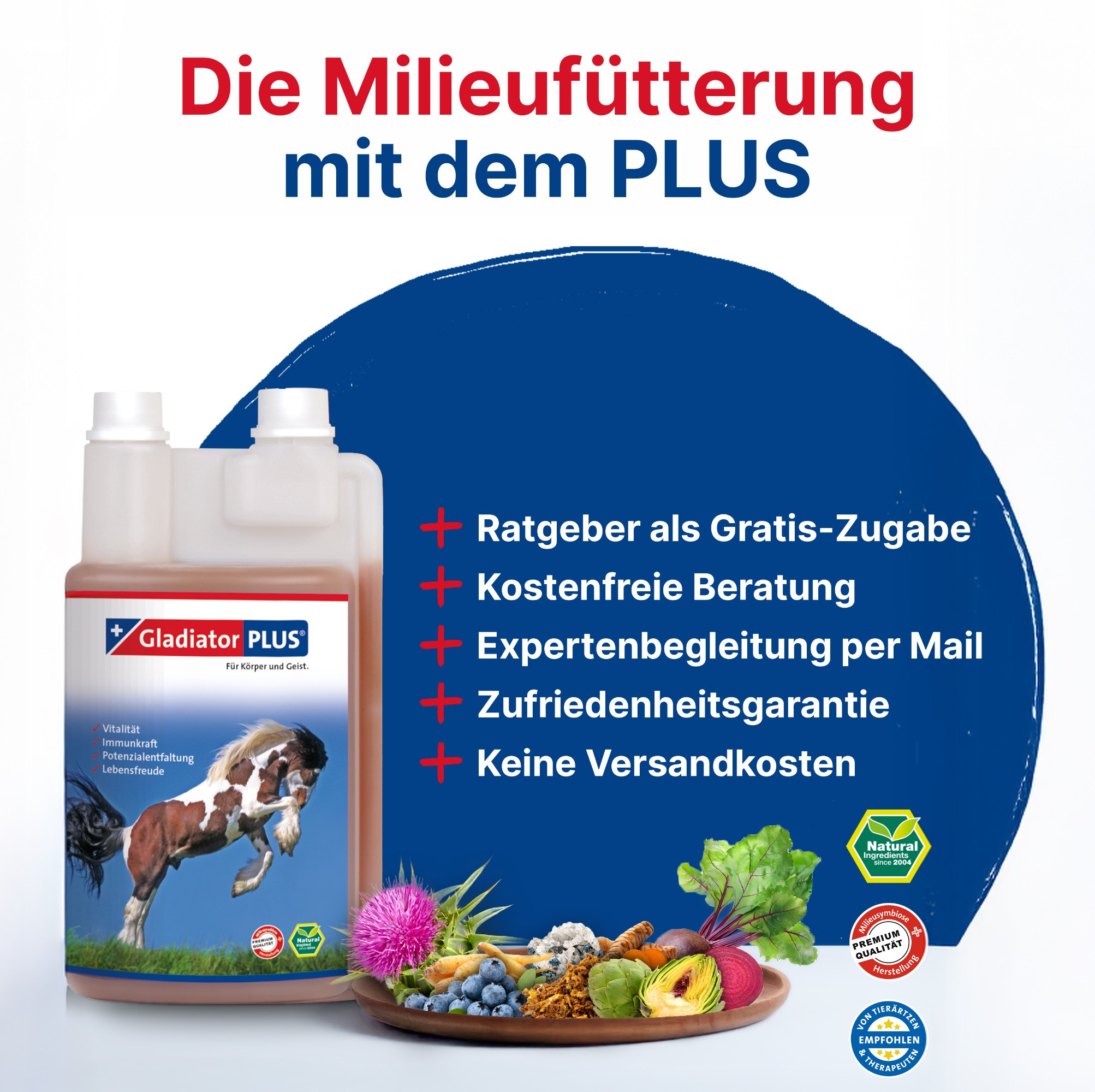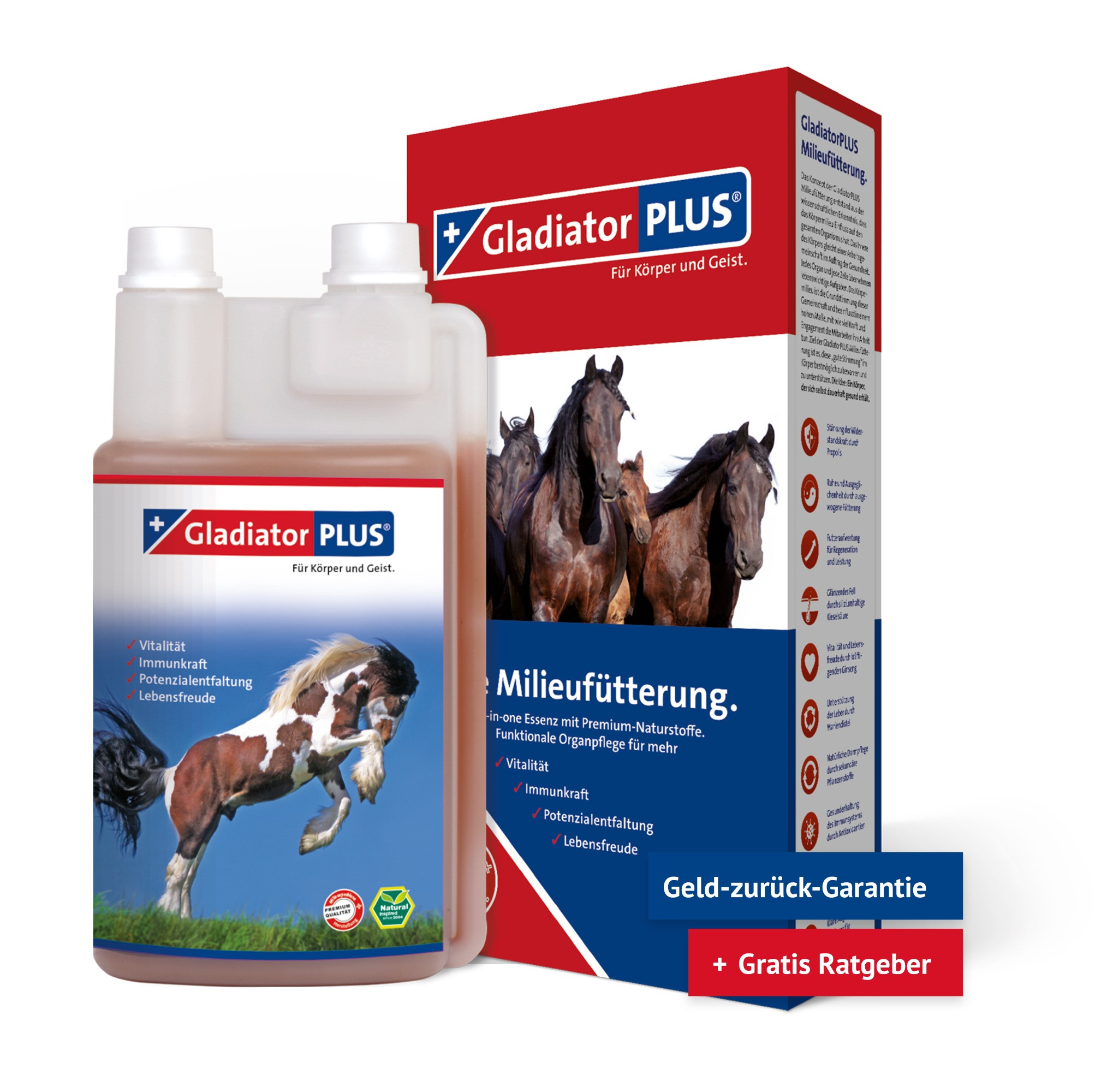 Weil es nicht einzelne Symptome bekämpft, sondern den gesamten Organismus deines Pferdes ganzheitlich unterstützt. Die Milieufütterung stärkt zentrale Gesundheitsbereiche wie Körpermilieu, Stoffwechsel, Leber, Darm und Immunsystem – also genau die Schaltstellen, die maßgeblich für Gesundheit und Lebensfreude verantwortlich sind. Die enthaltenen Naturstoffe sind so kombiniert, dass sie sich in ihrer Zusammensetzung optimal ergänzen und dein Pferd sie besonders gut verwerten kann. Das macht GladiatorPLUS zur intelligenten Lösung – für Tiere jeden Alters, jeder Rasse und bei den meisten Herausforderungen.