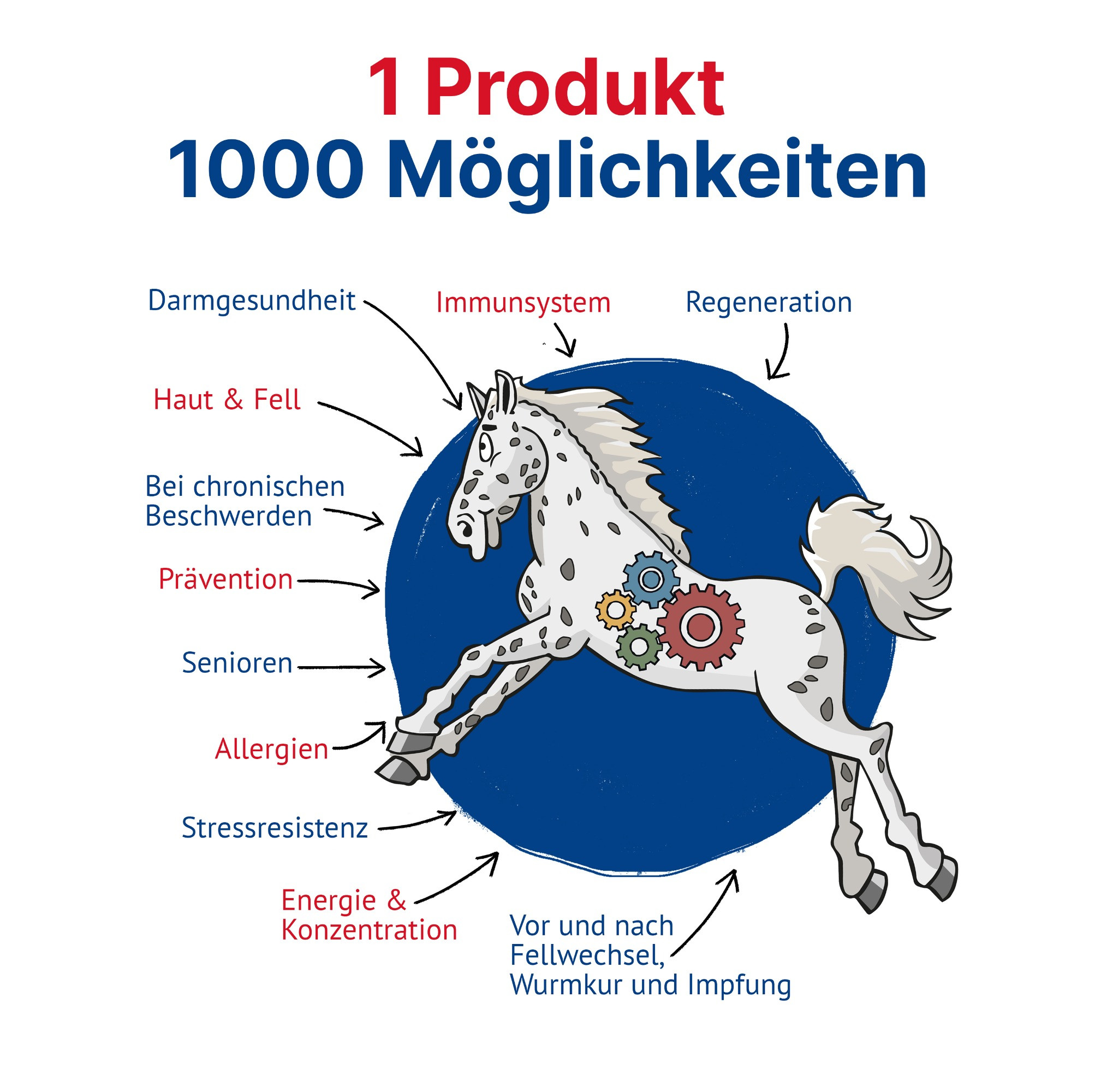 DER CLOU: Die All-in-one-Essenz aus Premium-Naturstoffen unterstützt nicht nur bestimmte Bereiche, sondern den gesamten Pferdekörper. Mit einem konzentrierten Schluck pro Tag.