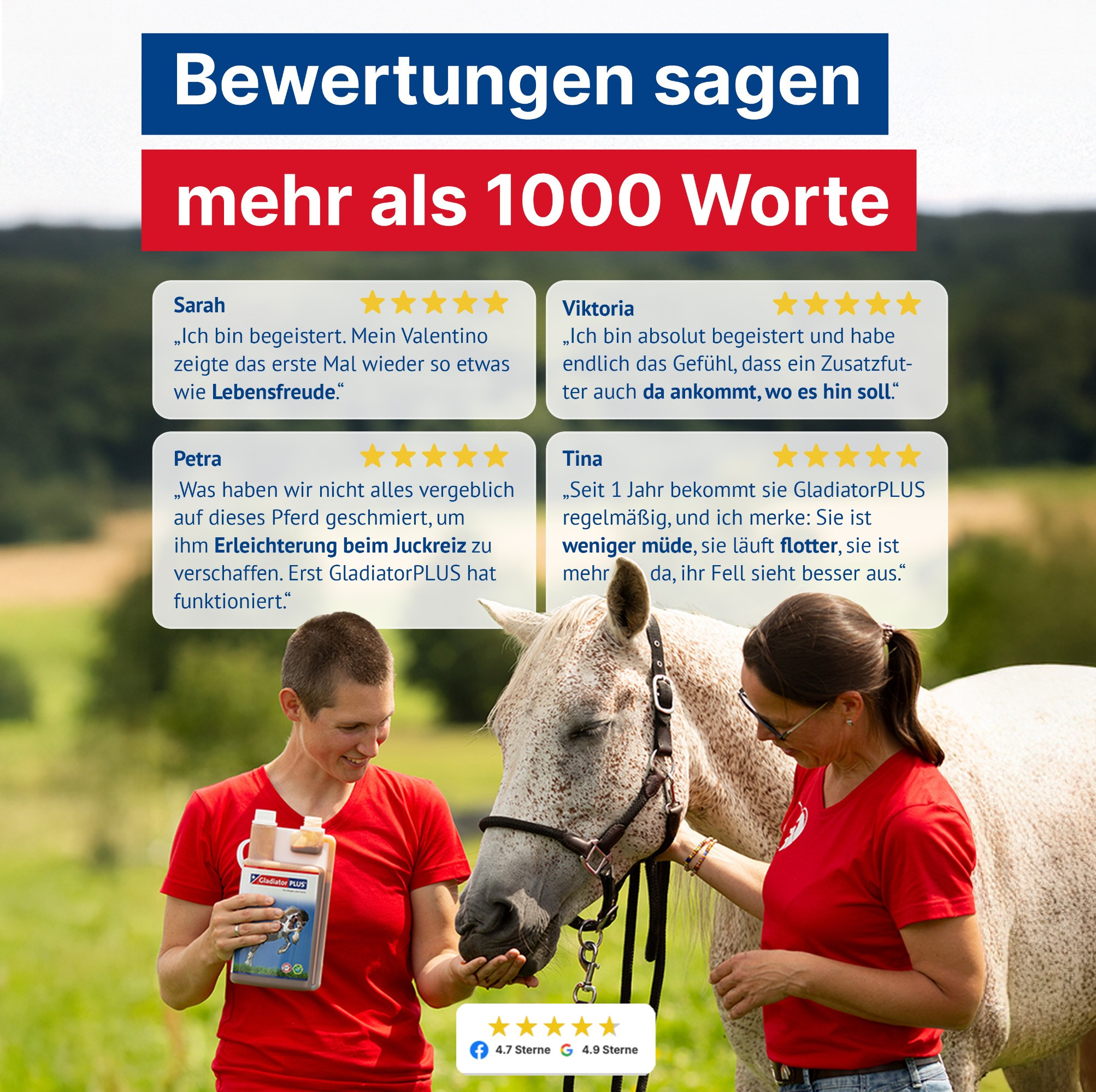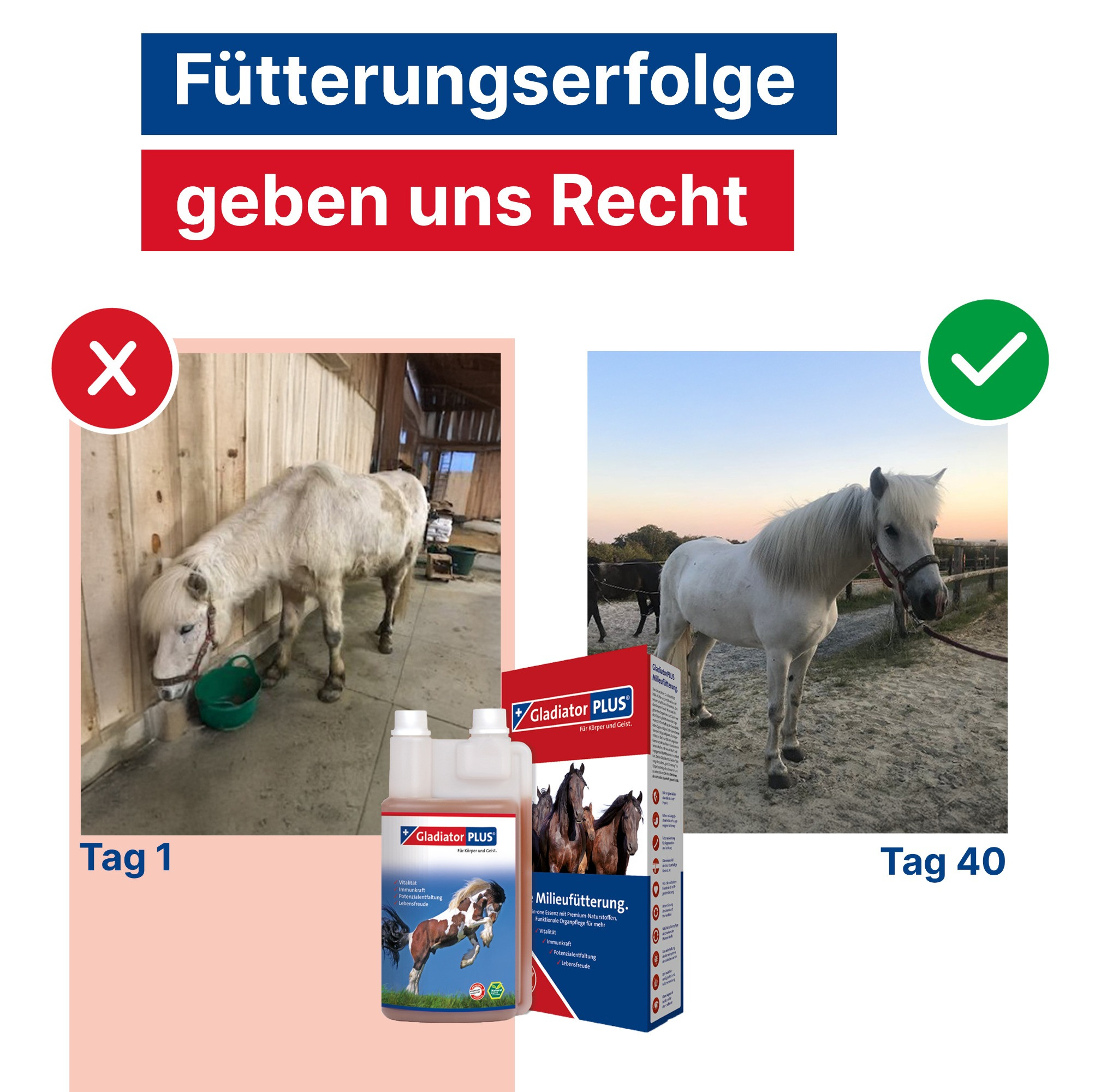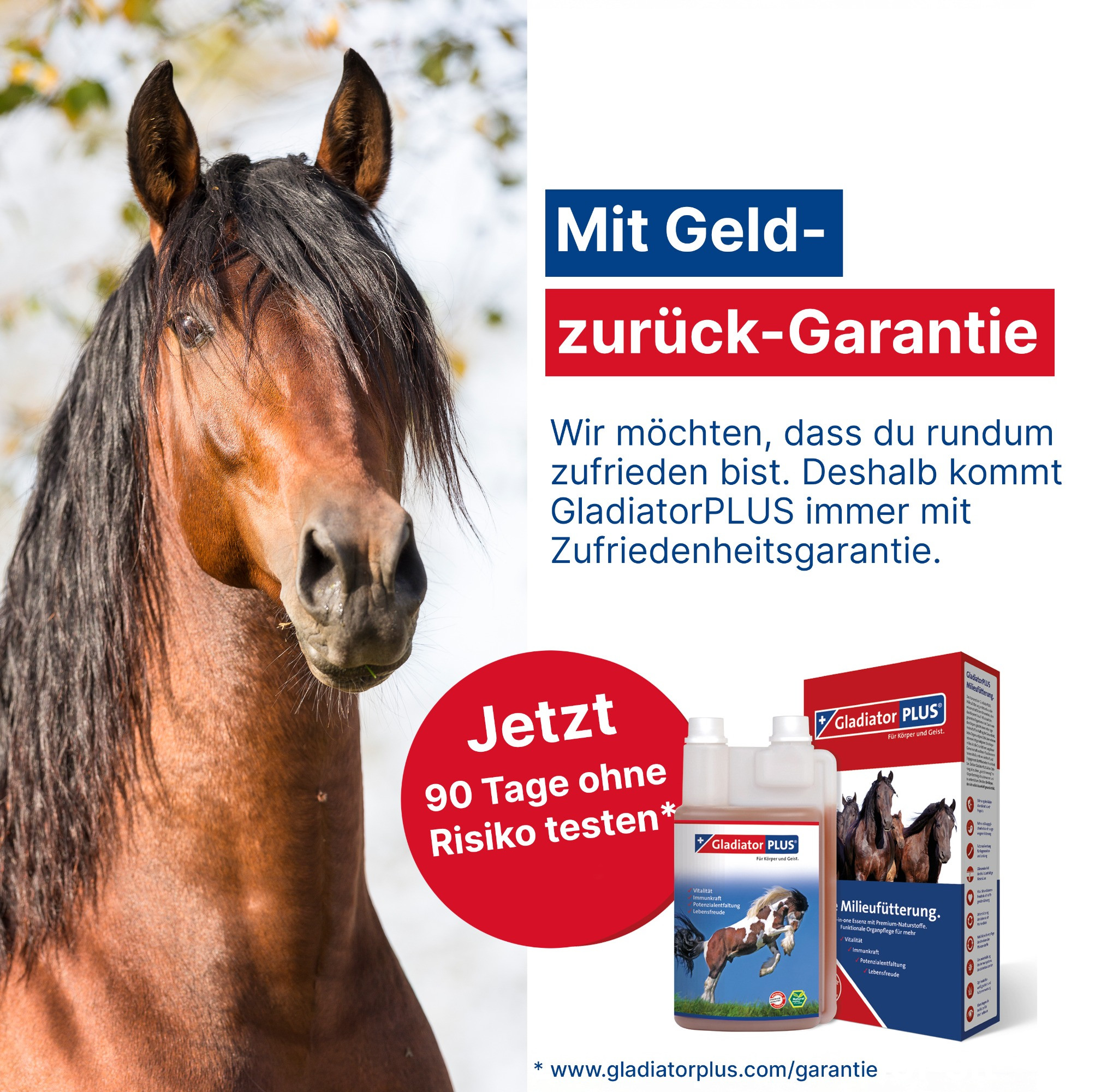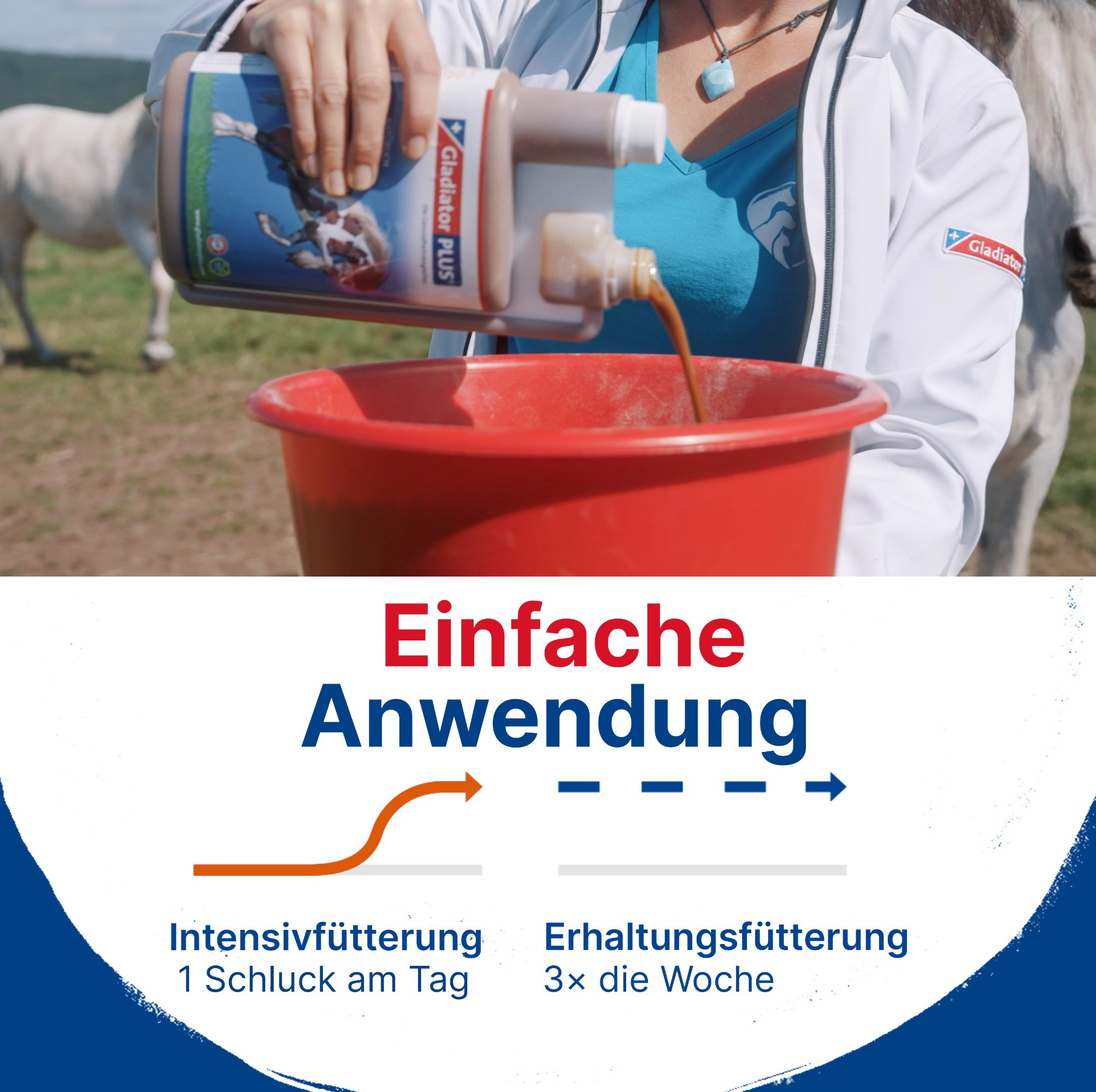 GladiatorPLUS wird über das Futter gegeben und sollte deinem Pferd individuell nach Bedarf angepasst werden. Es ersetzt kein Kraft- oder Mineralfutter.