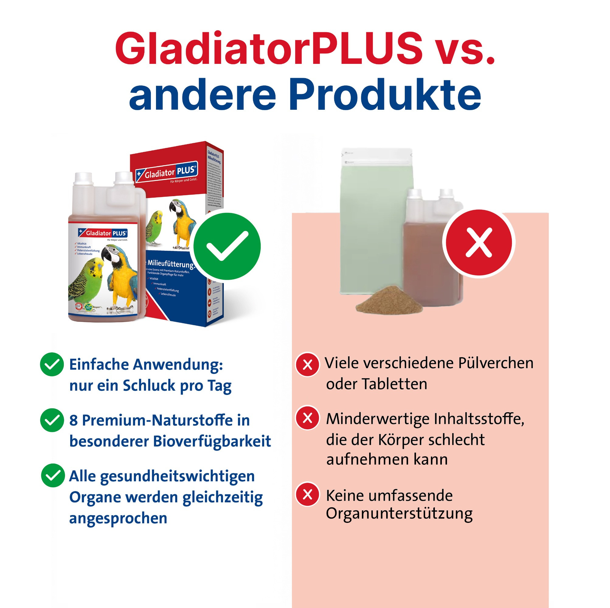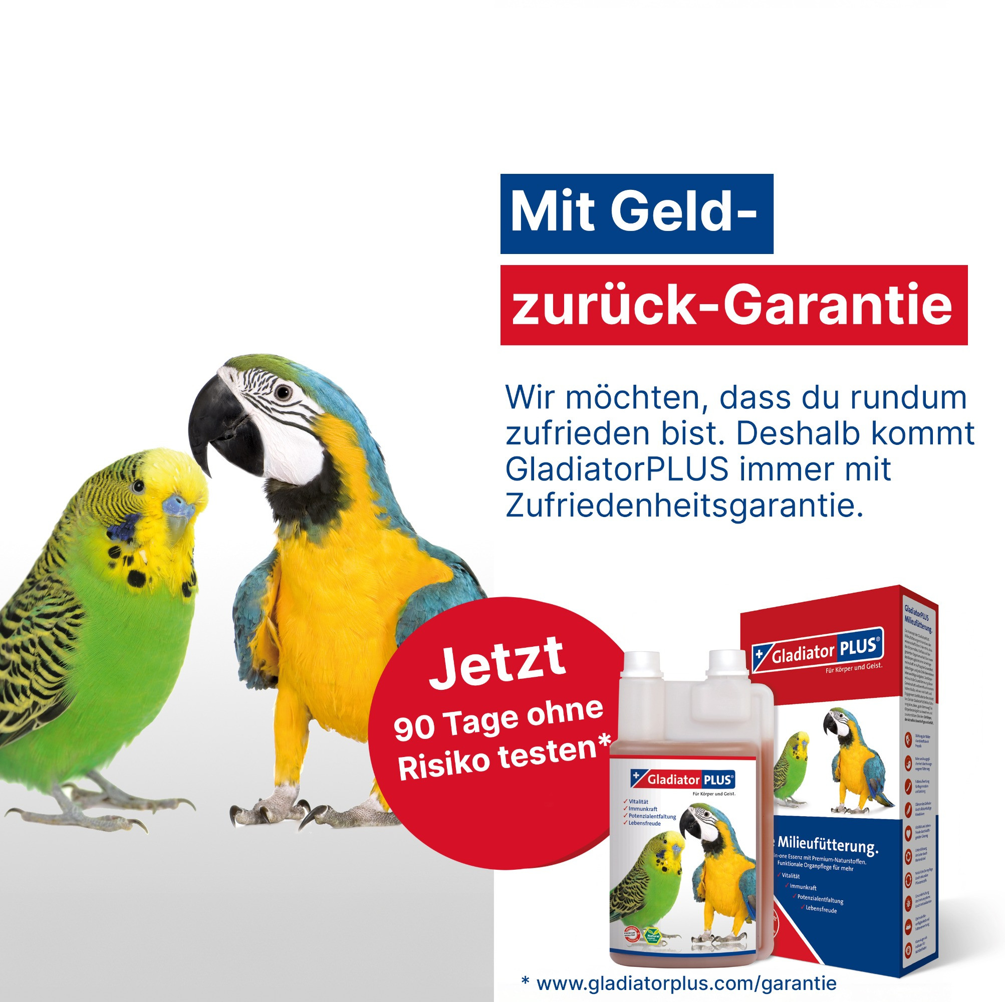 GladiatorPLUS ist eine All-in-one-Essenz, die deinem Vogel hilft, in 40 Tagen mehr Vitalität, Immunkraft und Lebensfreude zu erreichen. Acht bioverfügbare Premium-Naturstoffe fördern in Verbindung mit einer artgerechten Haltung und Fütterung die natürliche Gesundheit und tragen so dazu bei, das Krankheitsrisiko zu senken.