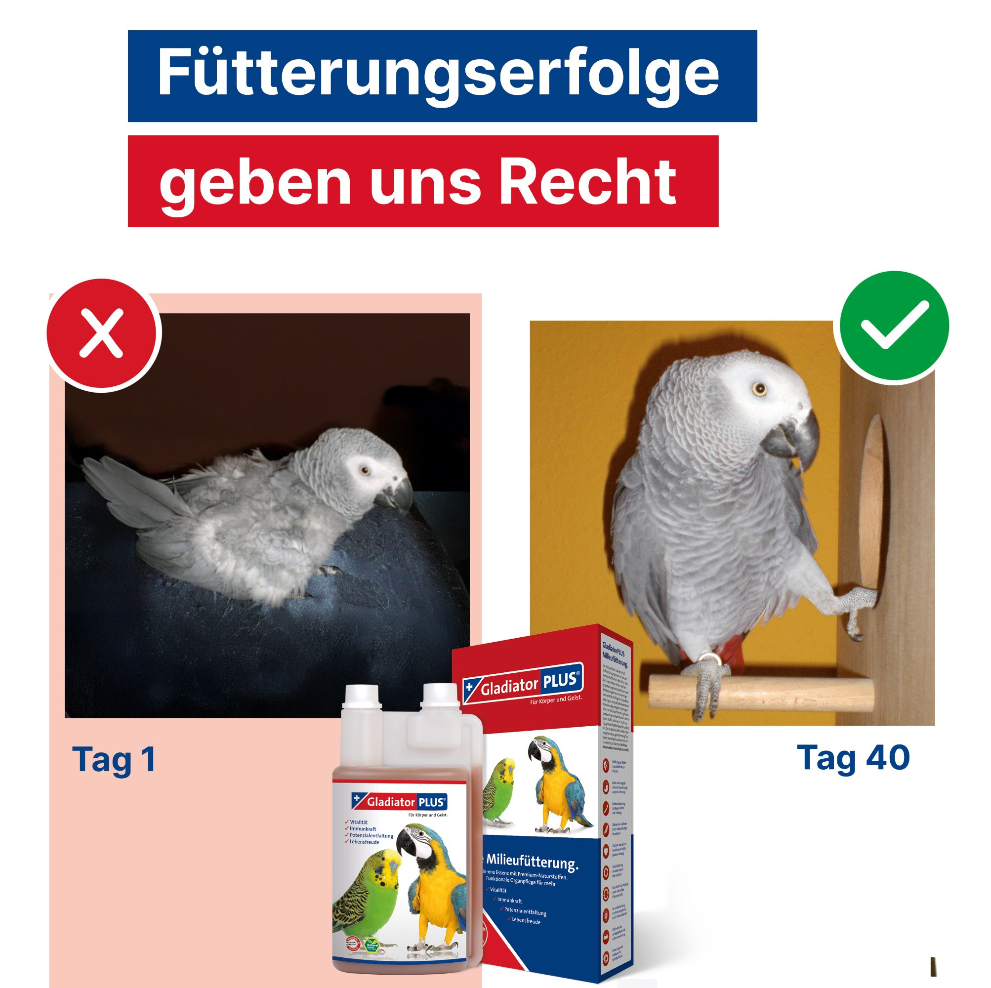 Zu Beginn (oder nach längerer Pause) wird GladiatorPLUS als 40-Tage-Intensivfütterung täglich gefüttert. Ziel dieser ersten 40 Tage ist es, das Körpermilieu deines Vogels durch die Milieufütterung in Verbindung mit artgerechter Haltung und Fütterung im Gleichgewicht zu halten, die Darmgesundheit zu pflegen, das Immunsystem zu unterstützen und die natürliche Körperausleitung zu begleiten.