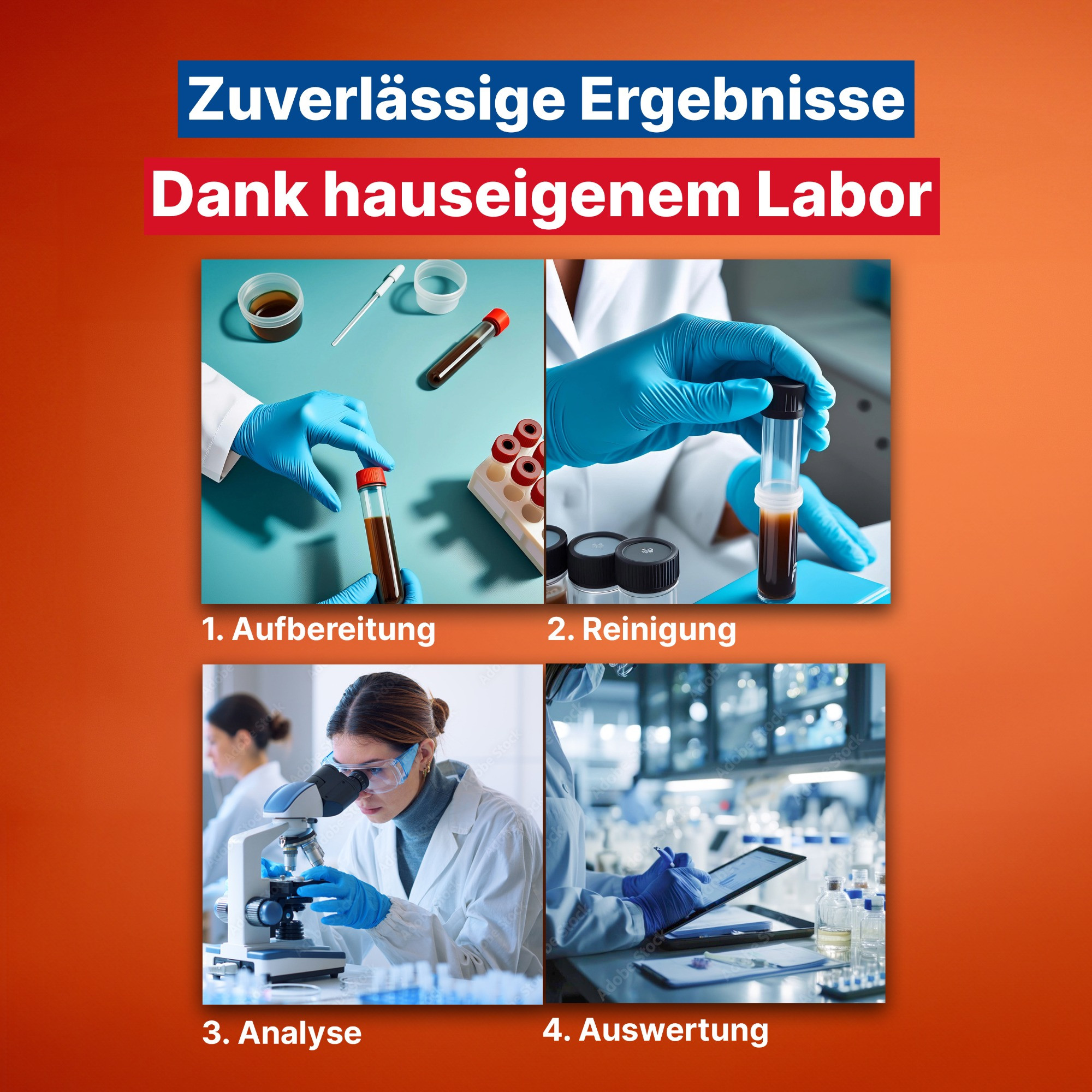 Dank unser hauseigenen präzisions speziellal Analysemethode, erreichen wir eine außergewöhnlich hohe Nachweissicherheit. Die Proben werden im hauseigenen Labor unter Leitung unseres erfahrenen Tierheilpraktikers und Laboranten Markus Kleemann analysiert – für maximale Genauigkeit und schnelle Ergebnisse. So erhältst du eine fundierte Grundlage für die gezielte und schonende Gesundheitspflege deines Tieres.
