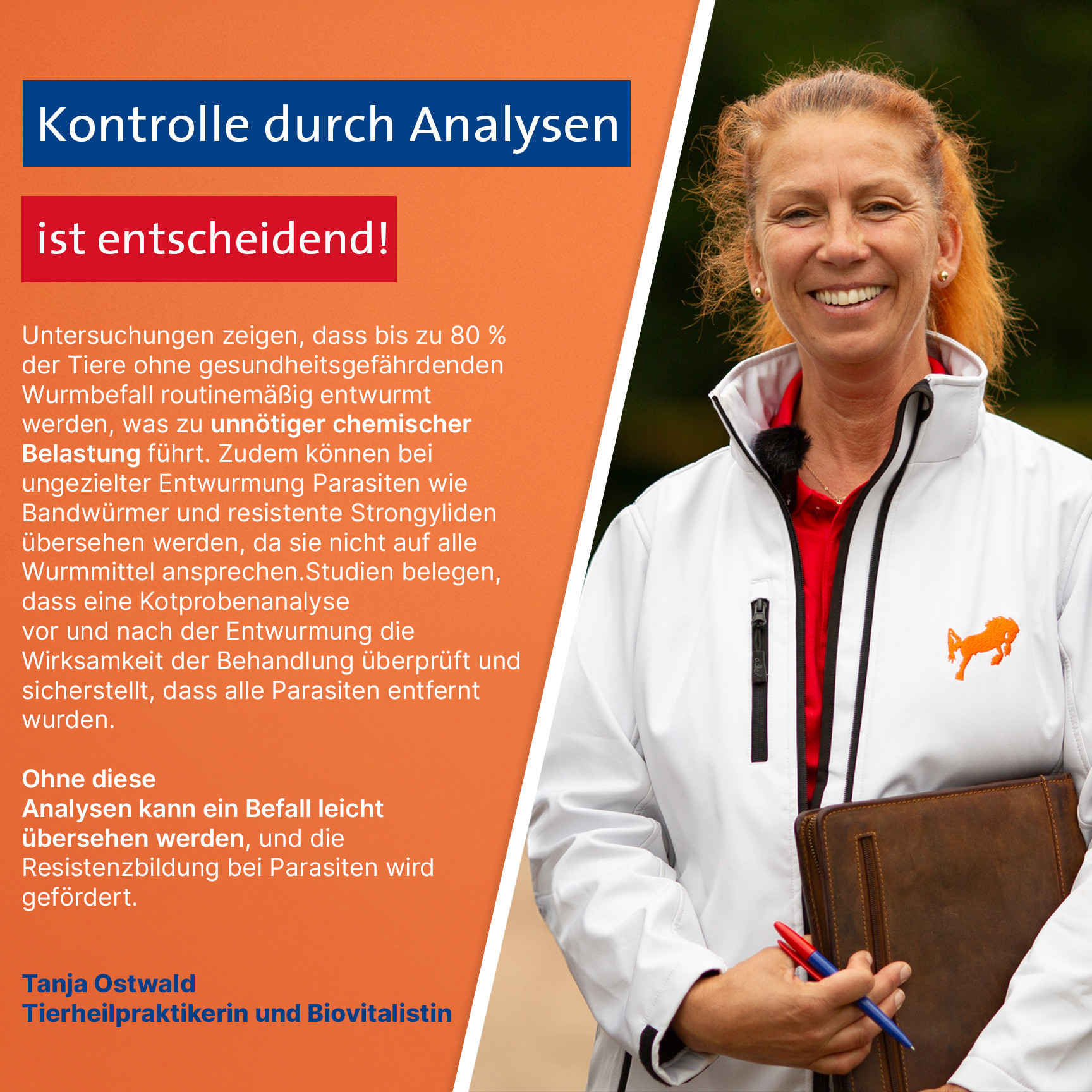 • Gezielte Entwurmung: Nicht alle Entwurmungsmittel wirken gegen alle Parasiten, daher ist es wichtig, den richtigen Wirkstoff zu wählen. WICHTIG: Du erhälts eine klare Handlungsempfehlung die du dann mit deinem Tierarzt oder Therapeuten besprechen kannst.