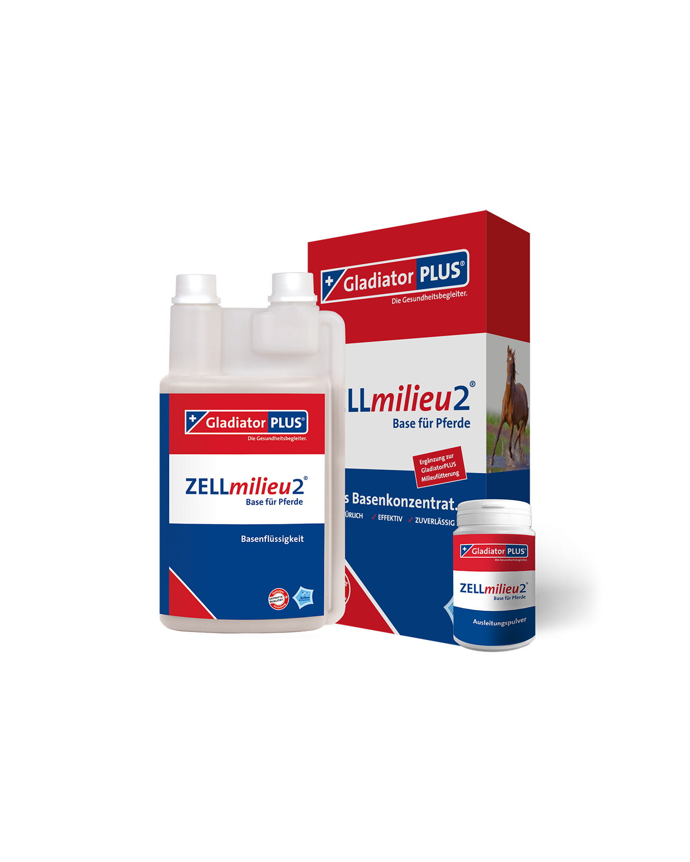 Warum besteht ZELLmilieu2 aus zwei Komponenten? Ein ausgeglichener Säure-Basen-Haushalt und eine funktionierende Ausleitung sind Grundvoraussetzungen für Gesundheit und Vitalität. Beides steht immer in einem engen Zusammenhang. Die Kunst besteht darin, möglichst alle erforderlichen Prozesse gleichzeitig anzusprechen: Säuren neutralisieren und freisetzten, Schadstoffe binden und ausleiten. Basenflüssigkeit und Ausleitungspulver arbeiten hier optimal Hand in Hand. Eine weitere Besonderheit von ZELLmilieu2: Die spezielle Zusammensetzung des Ausleitungspulvers. Mit Zeolith, Montmorillonit, Braunalge, Zink, Schwefel und Löwenzahnwurzel ist auch hier gleich eine multiple Kombination aus bewährten Heilerden, Mineralien und Naturstoffen aktiv. Eine optimale Kombination für Entsäuerung und Ausleitung und damit eine optimale Unterstützung einer Grundstimmung im Pferdekörper.